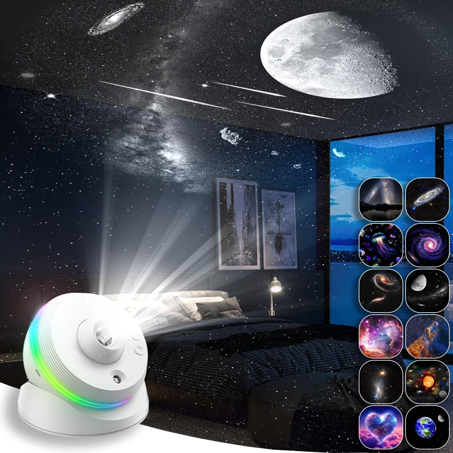 De projector beschikt over een soepele draaifunctie, waarmee je eenvoudig de projectierichting verandert en dynamische visuele effecten creëert, zoals een langzame rotatie die doet denken aan een draaiende aarde. Hij wordt geleverd met 13 verschillende verwisselbare filmsets, zodat je kunt afwisselen tussen diverse sterrenpatronen, galaxyeffecten en andere fantasierijke scènes.